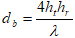 雙射線模式給出的路徑損耗被寫成為收發之間的距離d的函數,并且可以用兩個不同斜率n1 和n2 的直線段近似。兩線段之間的突變點也稱為拐點出現在離發射端的距離為: