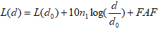從上式發現路徑損耗是對數正態分布的。平均路徑損耗指數n 和標準差σ 是取決于建筑物類型、建筑物側面以及發射機和接收機之間樓層數的參數。在收發間隔距離d 米處的路徑損耗可以給出: