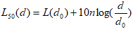 式中L50(d ) 是平均路徑損耗dB,d 是收發之間的距離m,L (d0 ) 是發射點到參考距離d0 的路徑損耗,d0 是參考距離m,n 是取決于環境的平均路徑損耗指數。參考路徑損耗可以通過測試或利用自由空間路徑損耗表示式計算得到。